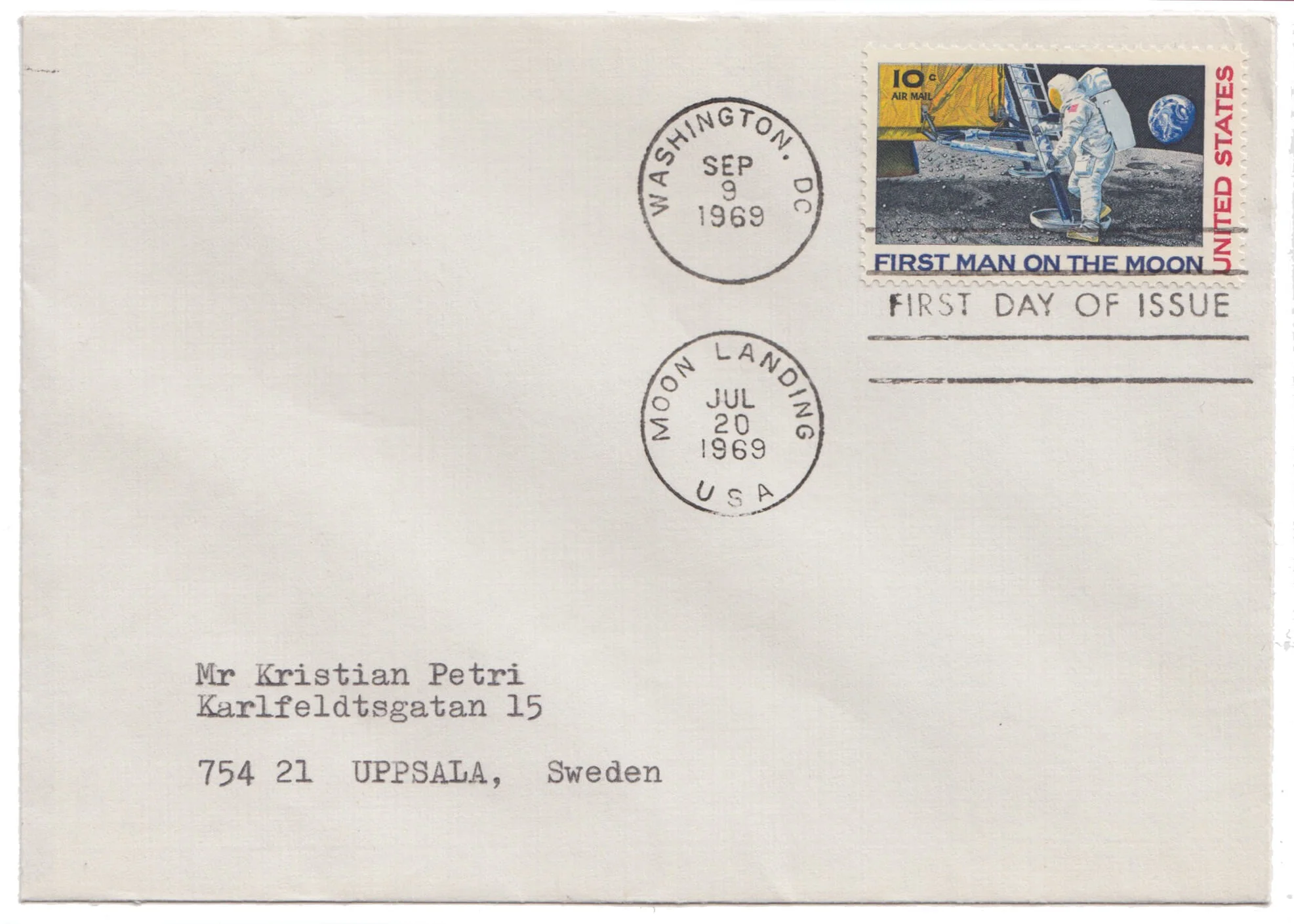 Detta är ett förstadagsbrev med en stämpel som varit på månen. Det var en present till mig från farfar som var en passionerad frimärkssamlare. Vi tillbringade långa stunder tillsammans med dessa frimärken. Efter hans död ärvde jag hela samlingen som jag tyvärr sålde några år senare. Det enda frimärket som finns kvar är detta.